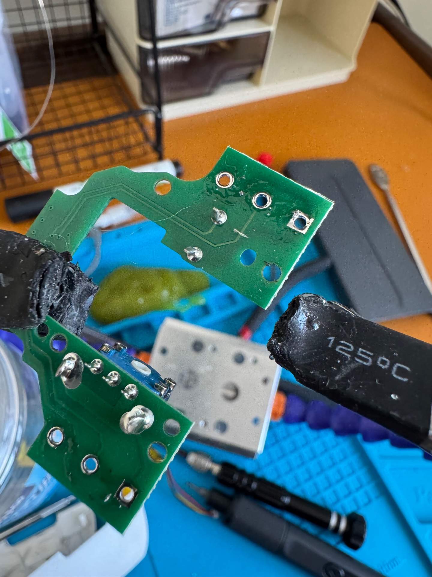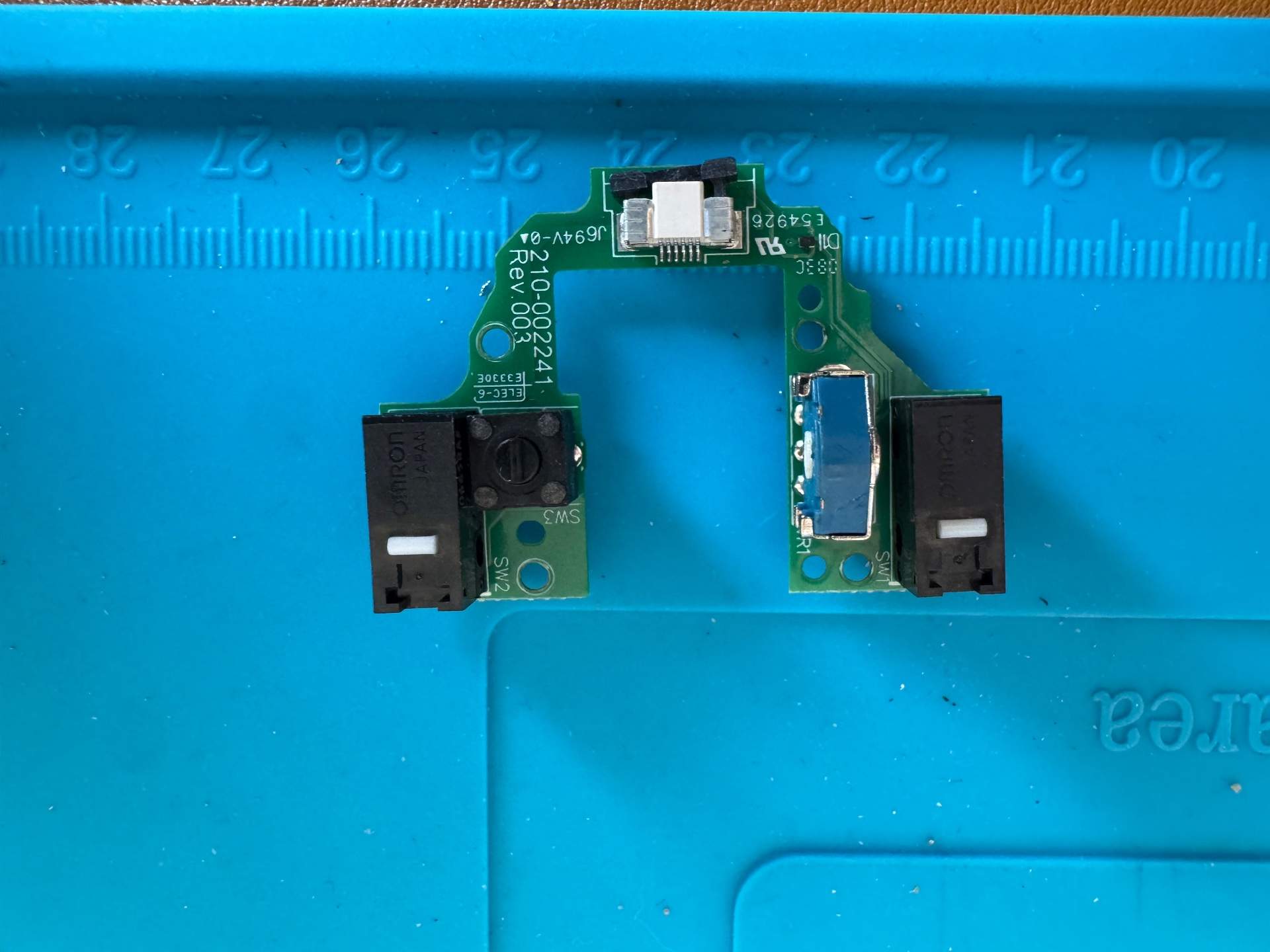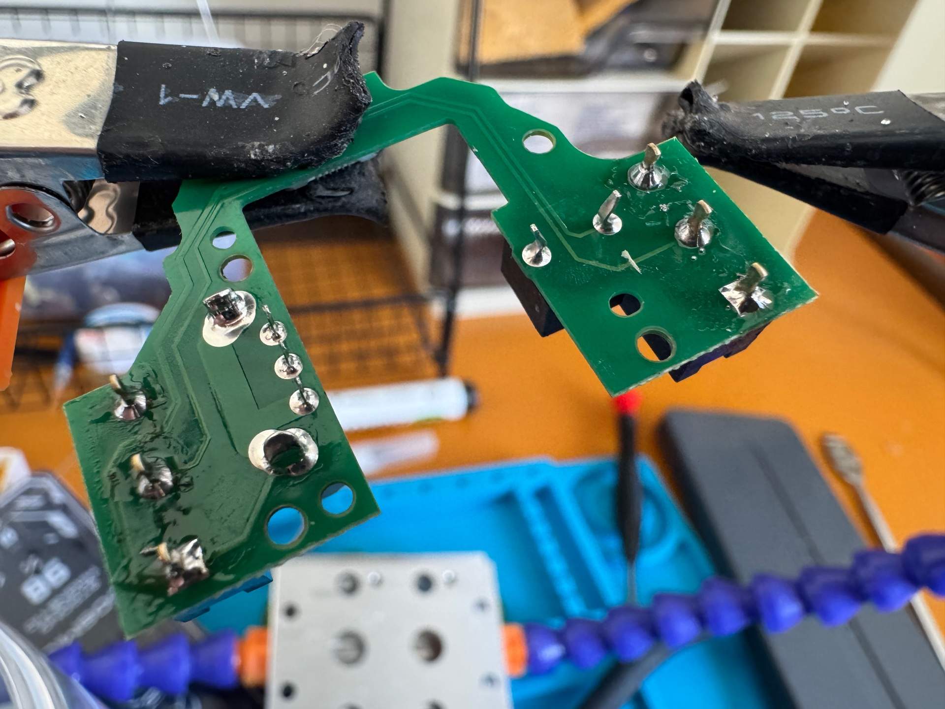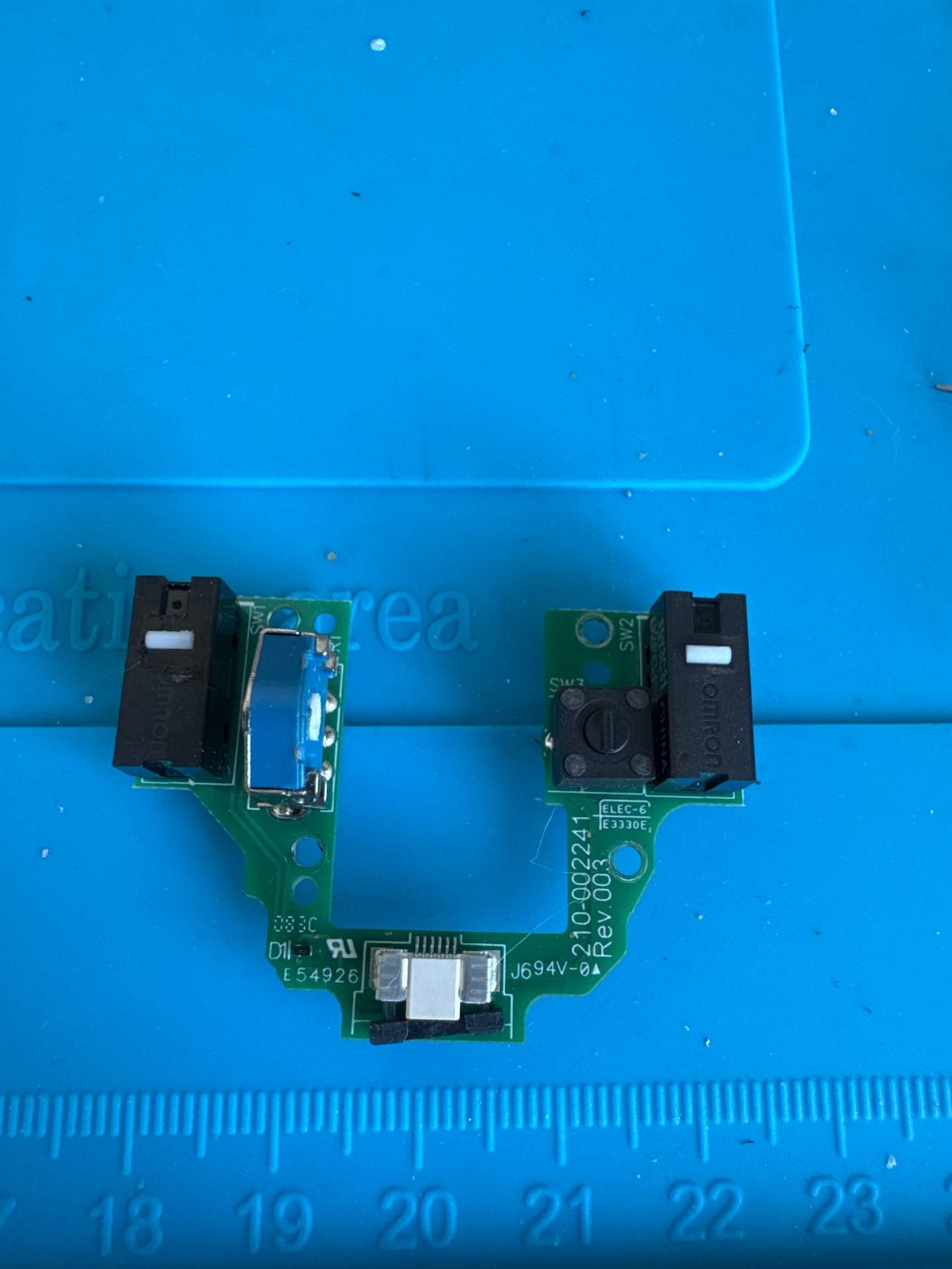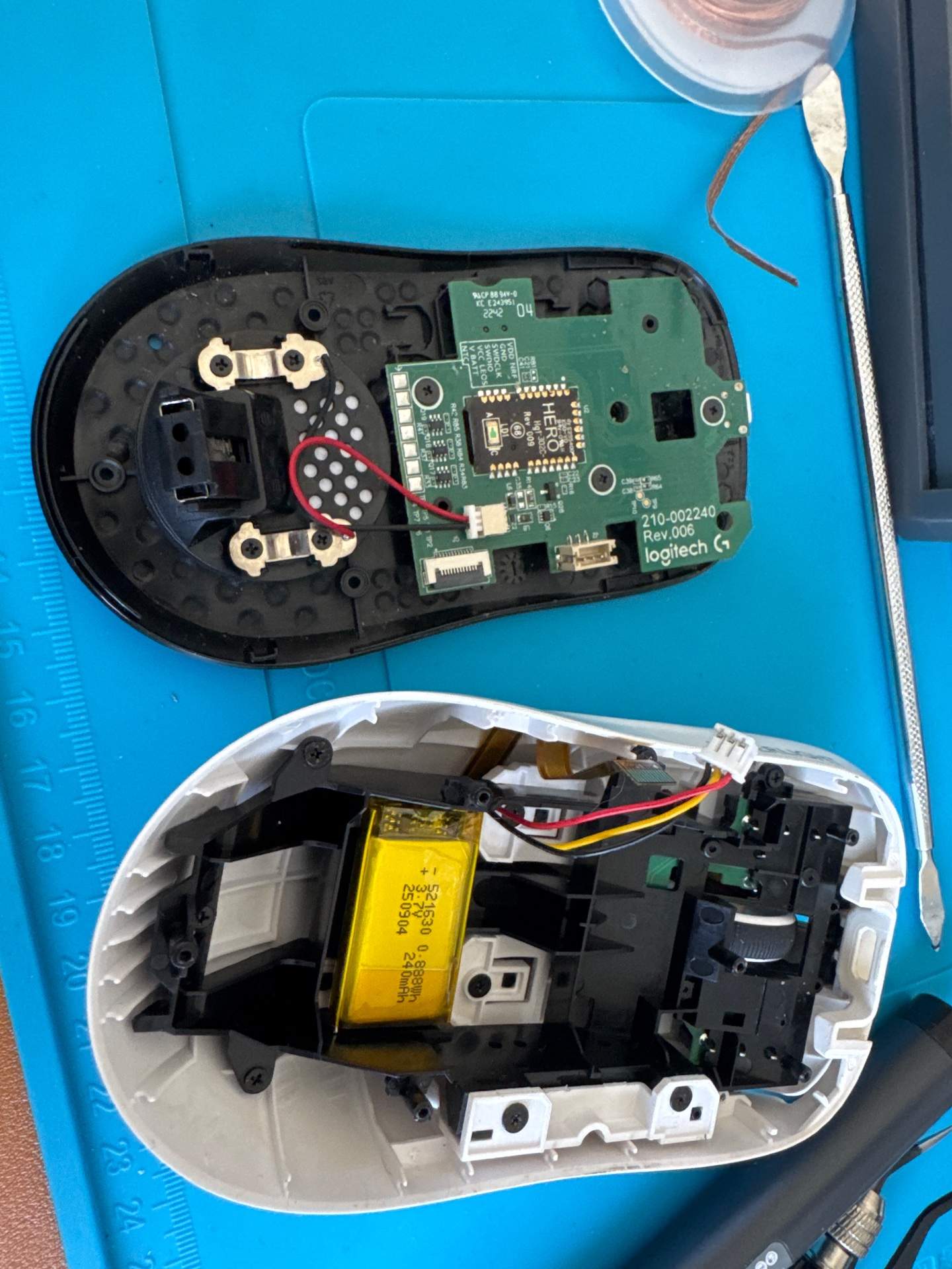 罗技GPW2(狗屁王 2 代)左键不回弹-福建泉州陈先生 罗技GPW2客户反馈左键不回弹,经过检测是因为微动长时间的老化,已经塌陷无法使用,为客户的左右微动都更换为【欧姆龙】白点D2F-F-3-7(日产),同时真对手感的问题,使用金属垫片进行垫高,优化空键程的问题。 已完结 维修过程图文 开始为序 2026-02-25 12:32:21 【开始维修】外壳已经拆开。 2026-02-25 12:38:37 【维修中】开始拆下原微动 2026-02-25 12:38:53 【维修中】原微动已经拆下,准备安装新微动 2026-02-25 12:44:46 焊接完成,开始组装 2026-02-25 12:46:51 客户左侧按键存在空键程的问题,免费为客户进行修补 2026-02-25 12:52:11 组装完成 2026-02-25 12:55:27 补充:客户鼠标曾经可能拆过,有多个螺丝滑丝 2026-02-25 12:55:47 开始测试 2026-02-25 12:56:50 测试通过 2026-02-25 12:59:29 快递发出 2026-02-25 13:00:28 ×