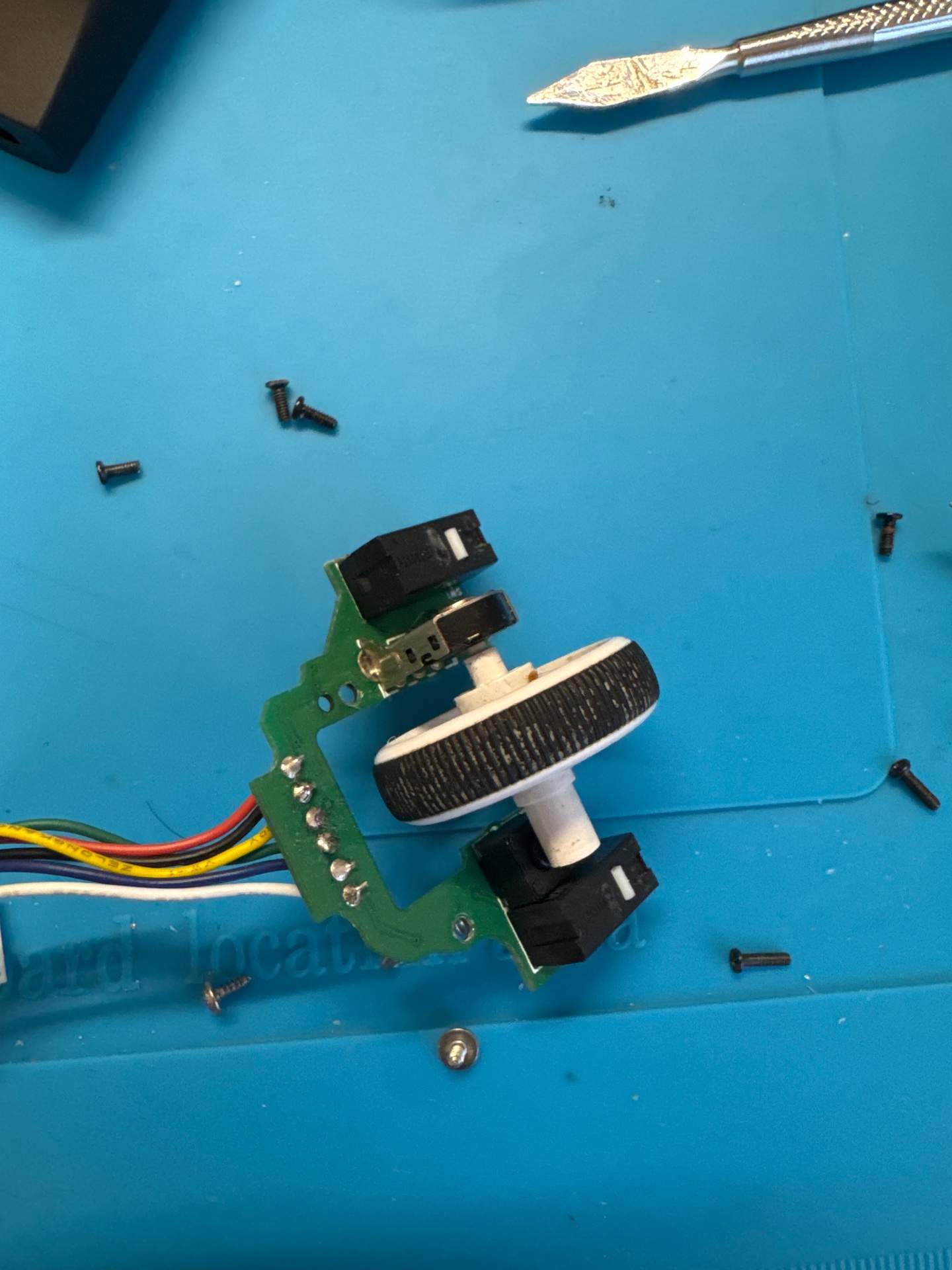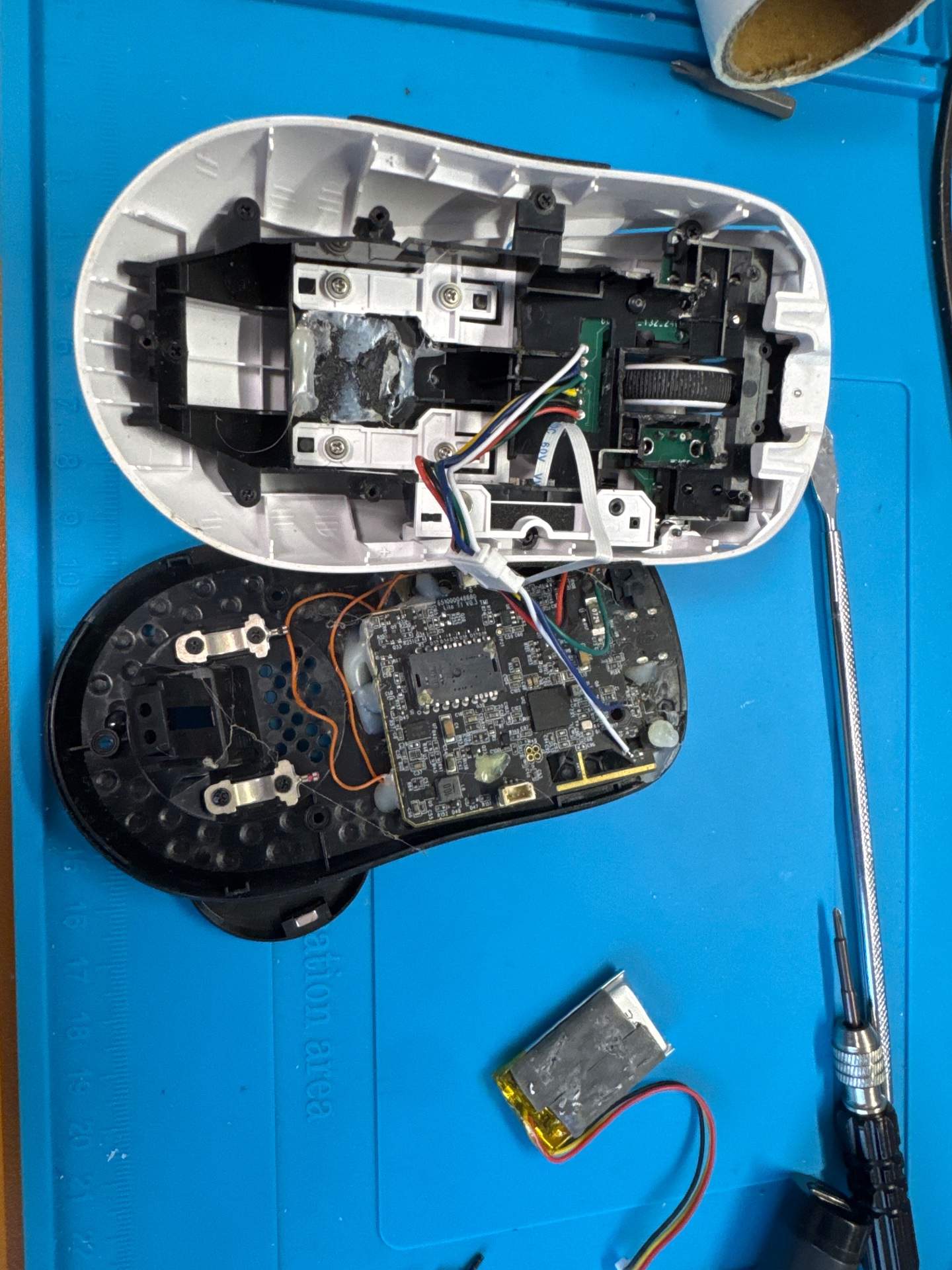 罗技 GPW2 的外壳,内部为雷蛇主板鼠标 滚轮回滚维修-广东省河源傅先生 客户的鼠标比较特殊,使用罗技 GPW2 的外壳,内部为雷蛇主板鼠标,两个鼠标拼接而成,当前的故障是滚轮回滚。经过拆解维修,完美复活。 已完结 维修过程图文 【收到包裹】快递已收到。准备开始维修。 2026-02-27 17:08:34 滚轮编码器损坏 2026-02-27 17:09:47 光标无线状态下经常性失灵 2026-02-27 17:09:54 【开始维修】外壳已经拆开。 2026-02-27 17:16:28 开始取消原装滚轮编码器 2026-02-27 17:40:31 开始拆一下原滚轮编码器 2026-02-27 17:43:52 已拆下 2026-02-27 17:51:06 编码器配件缺货,等待到货中,当前正在派件,预计今日稍晚可维修 2026-02-27 17:51:26 编码器到货,开始更换 2026-02-28 08:48:11 安装完成 2026-02-28 08:50:36 【维修中】新配件安装完成,开始组装外壳 2026-02-28 08:50:41 组装中 2026-02-28 08:56:28 组装完成 2026-02-28 09:04:47 测试通过 2026-02-28 09:05:24 ×