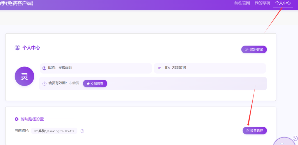 登录账号以后,点击右上角个人中心,设置草稿路径,两个软件的草稿路径需要一致,否者草稿会导入失败。