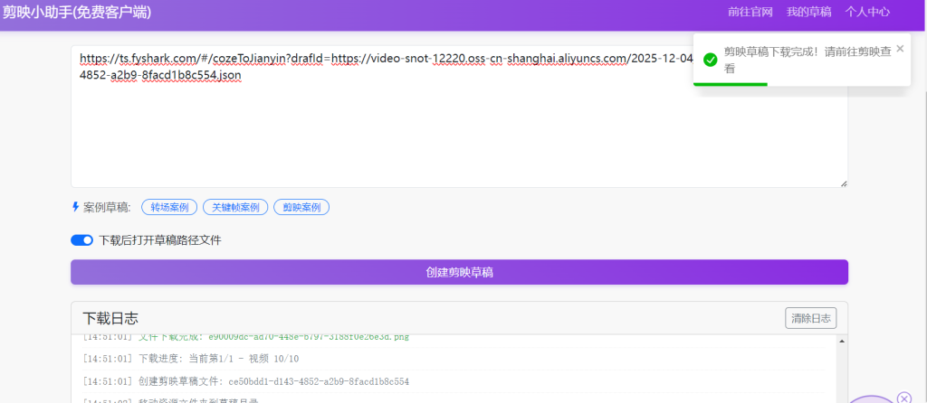 第八步:然后打开“剪映小助手”,将链接复制到“草稿地址”里面。然后点击“创建剪映草稿”,等到1分钟。