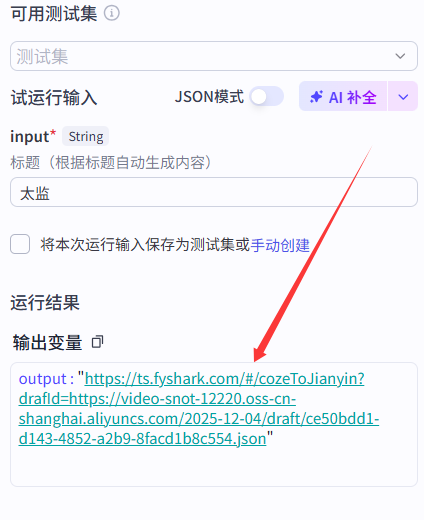 第七步:点击试运行,大约等待1-5分钟左右,右边菜单会有一个“输出变量”,咱们把里面的链接复制下来,注意:只复制链接。