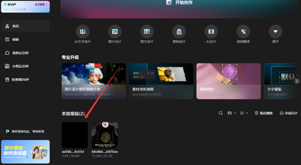 第九步:创建完成以后,咱们打开剪映,你会发现剪映多了一个“草稿文件”,那么这个草稿文件就是我们利用扣子生成出来的。如果没有出现这个草稿文件,那么关闭剪映,重新打开剪映就出现了。