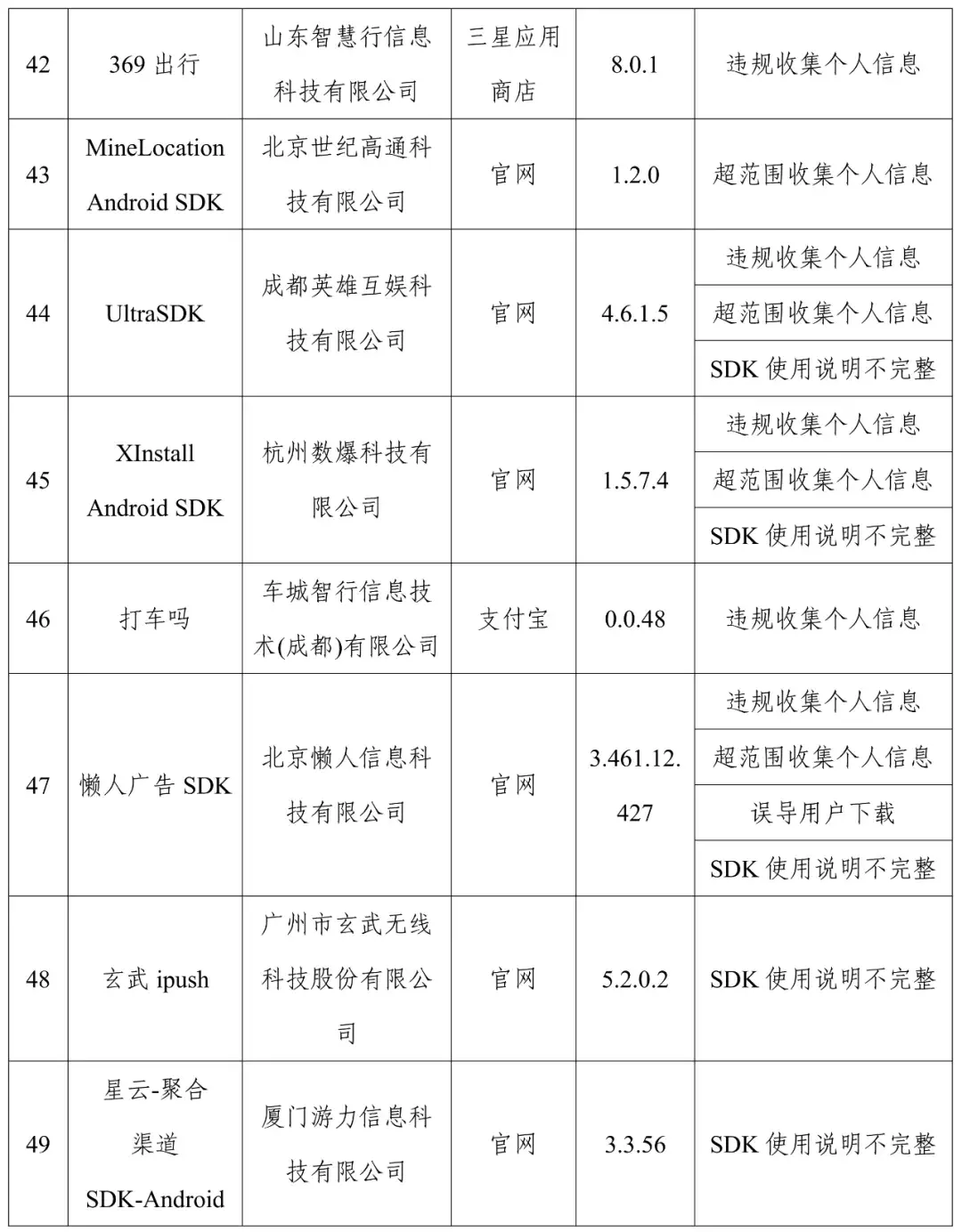工业和信息化部通报存在问题的APP(SDK)名单